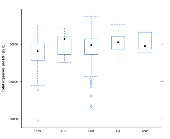 bwplot(Total ~ Party, data=big5, ylab="Total expenses per MP (in £)")